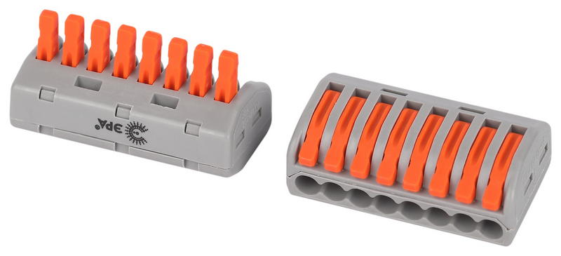 - конструкция механизма с рычажками обеспечивает многоразовый монтаж и демонтаж всех типов медных проводников: одножильных, многожильных и тонкопроволочных.